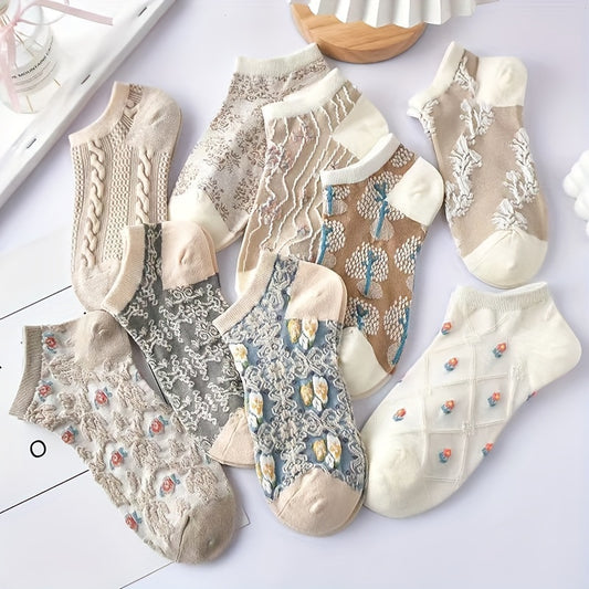 9 Paia di Calzini alla Caviglia da Donna con Stampa Floreale Retro - Morbidi e Leggeri a Taglio Basso con Pizzo & Decorazioni, Solo Lavaggio a Mano, Colori Assortiti per Occasioni Casual e Eleganti