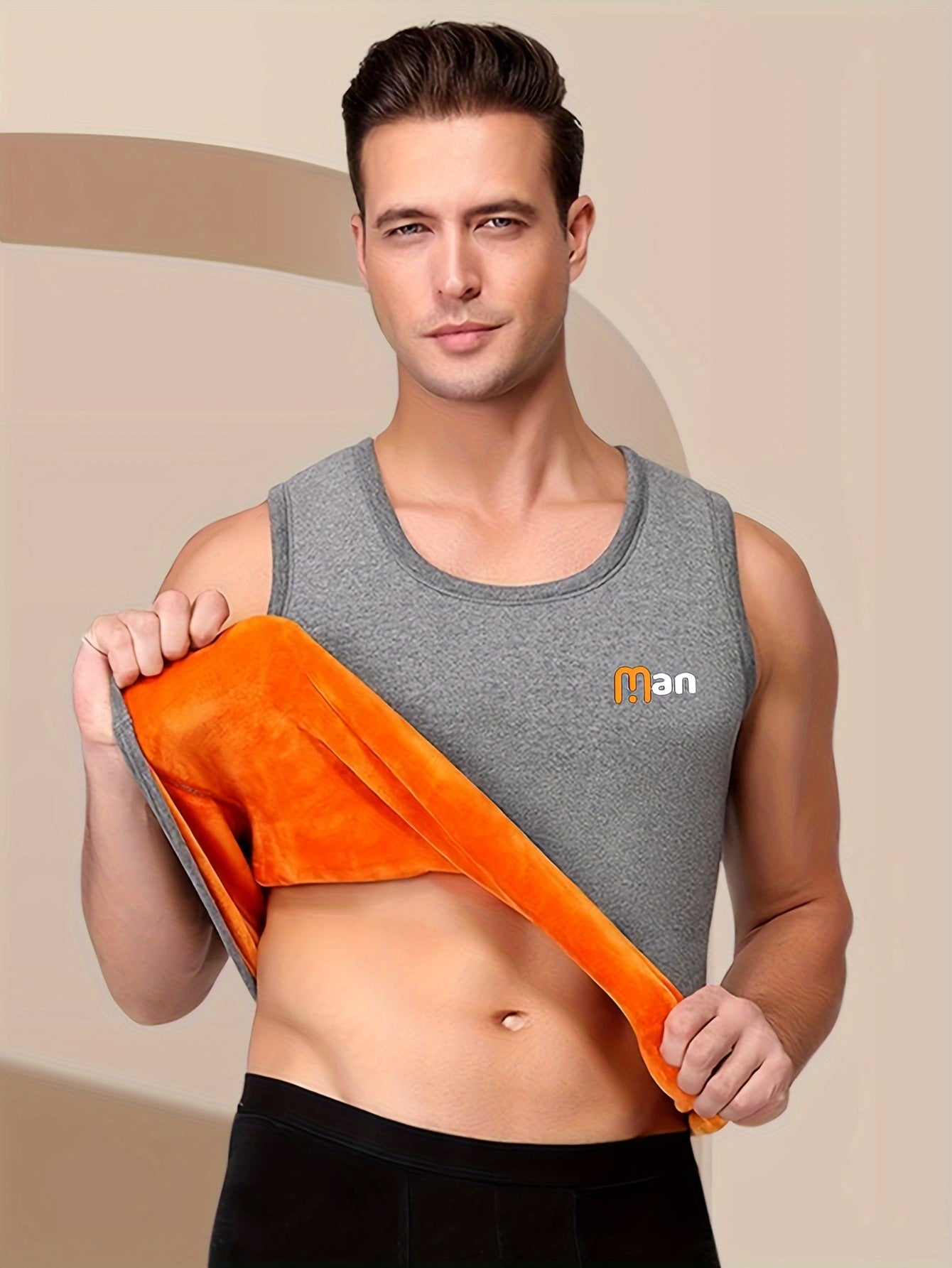 1pz Top da uomo termico foderato in fleece, stampa "MAN", gilet caldo autunno/inverno, impermeabile, poliestere 95% elastano 5%, tessuto a maglia, medio stretch, strato base atletico, spesso