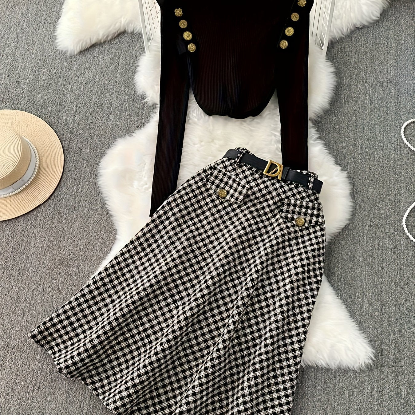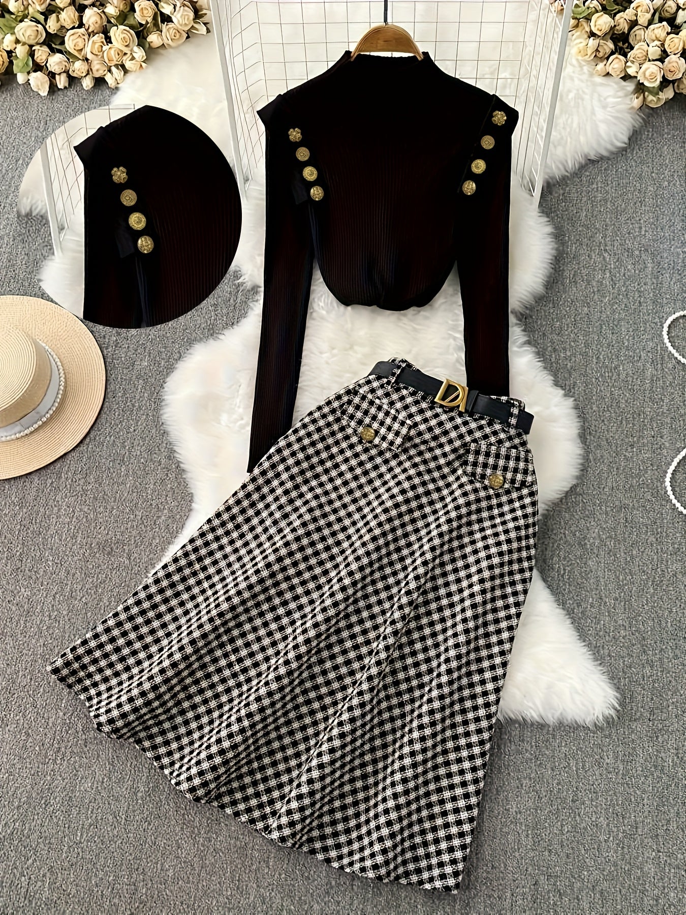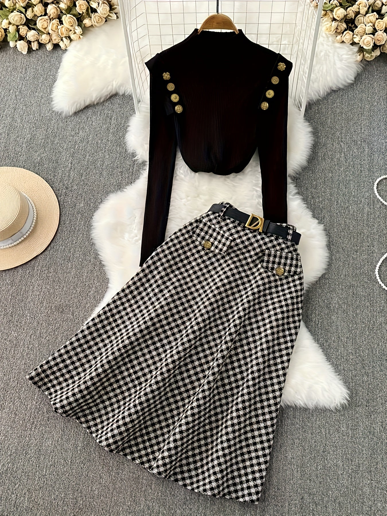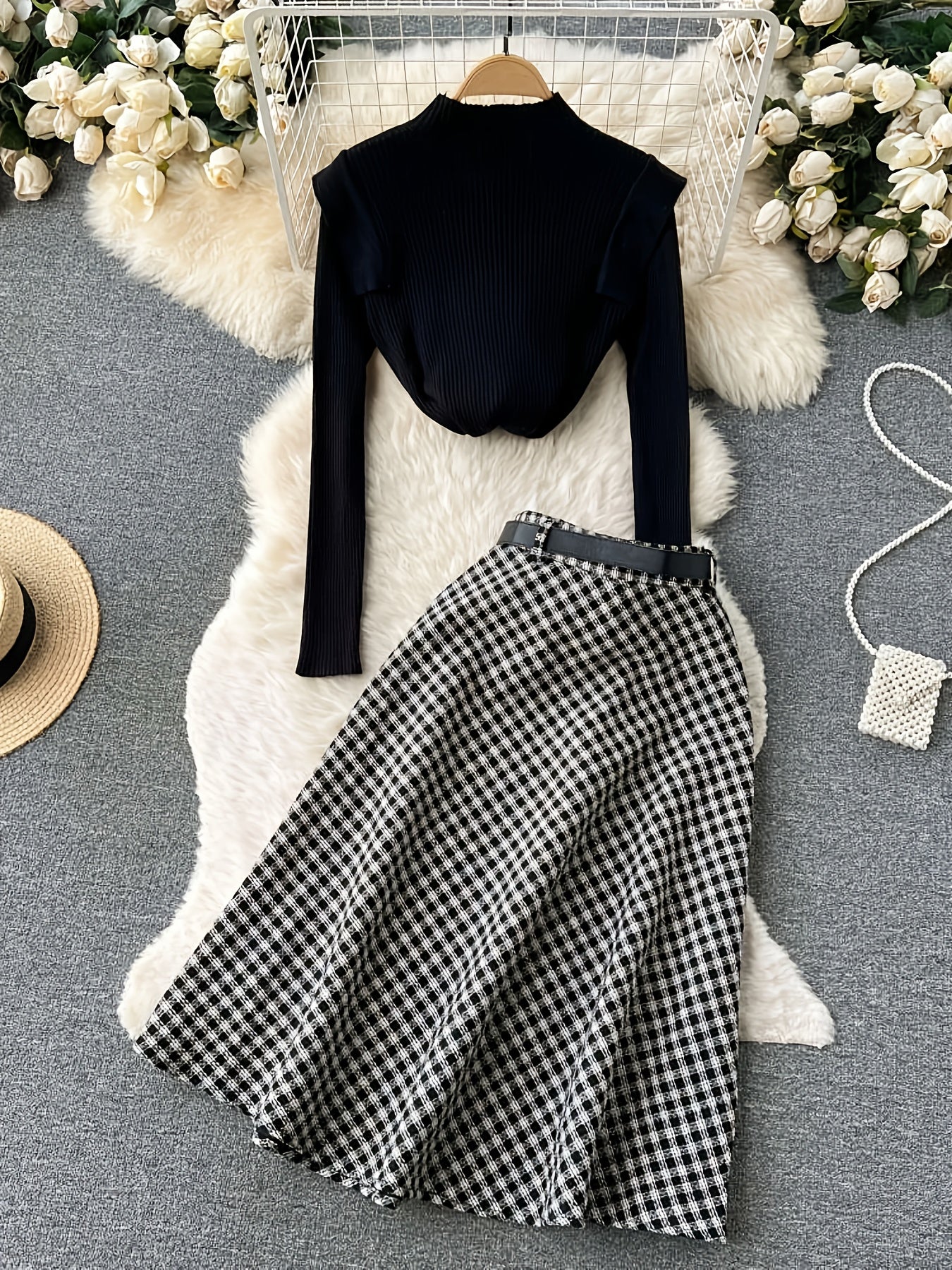 2025 Nuovo Set Due Pezzi Donna Autunno/Inverno Elegante Maglione a Collo Alto Manica Lunga Nera Gonna A-Line Vita Alta