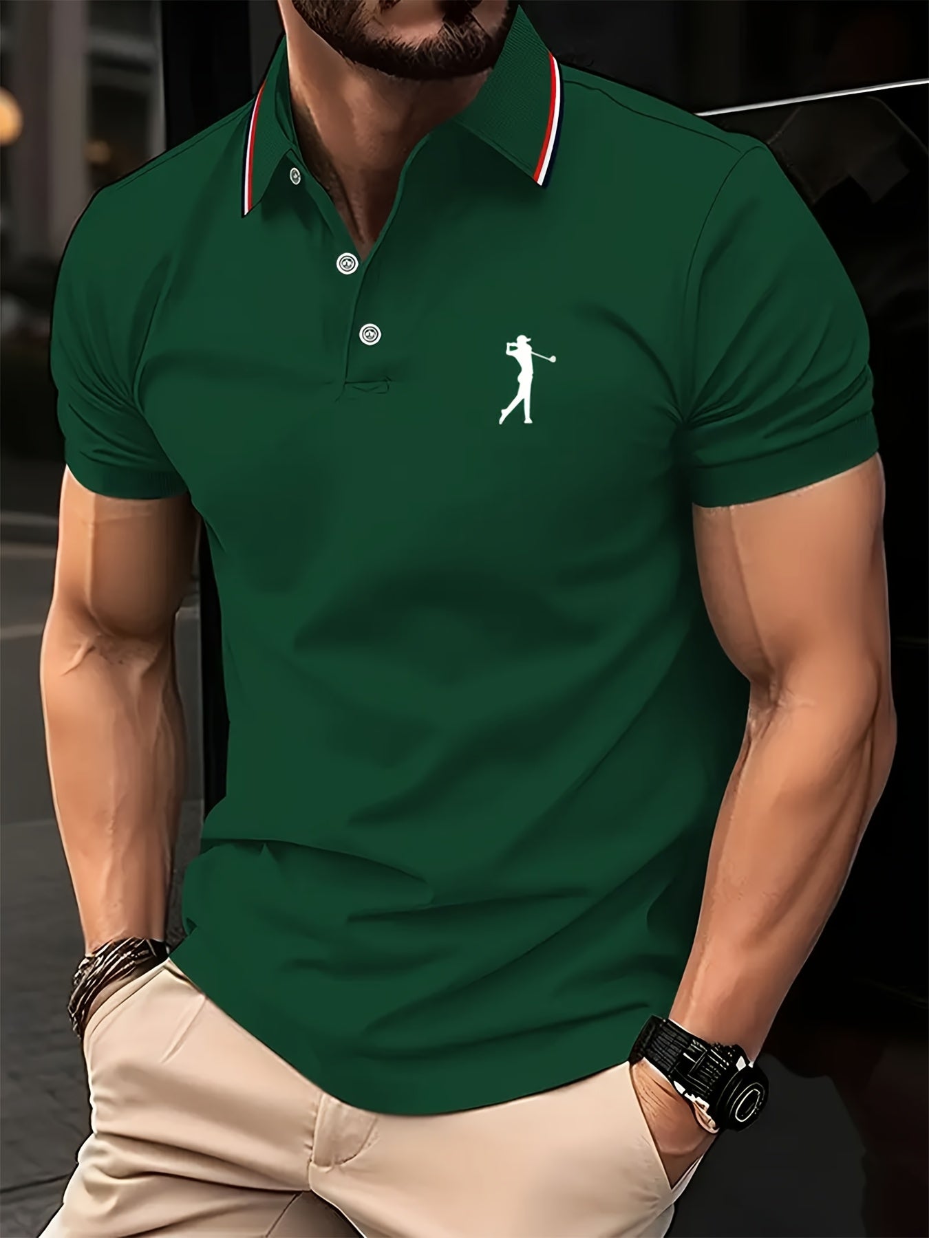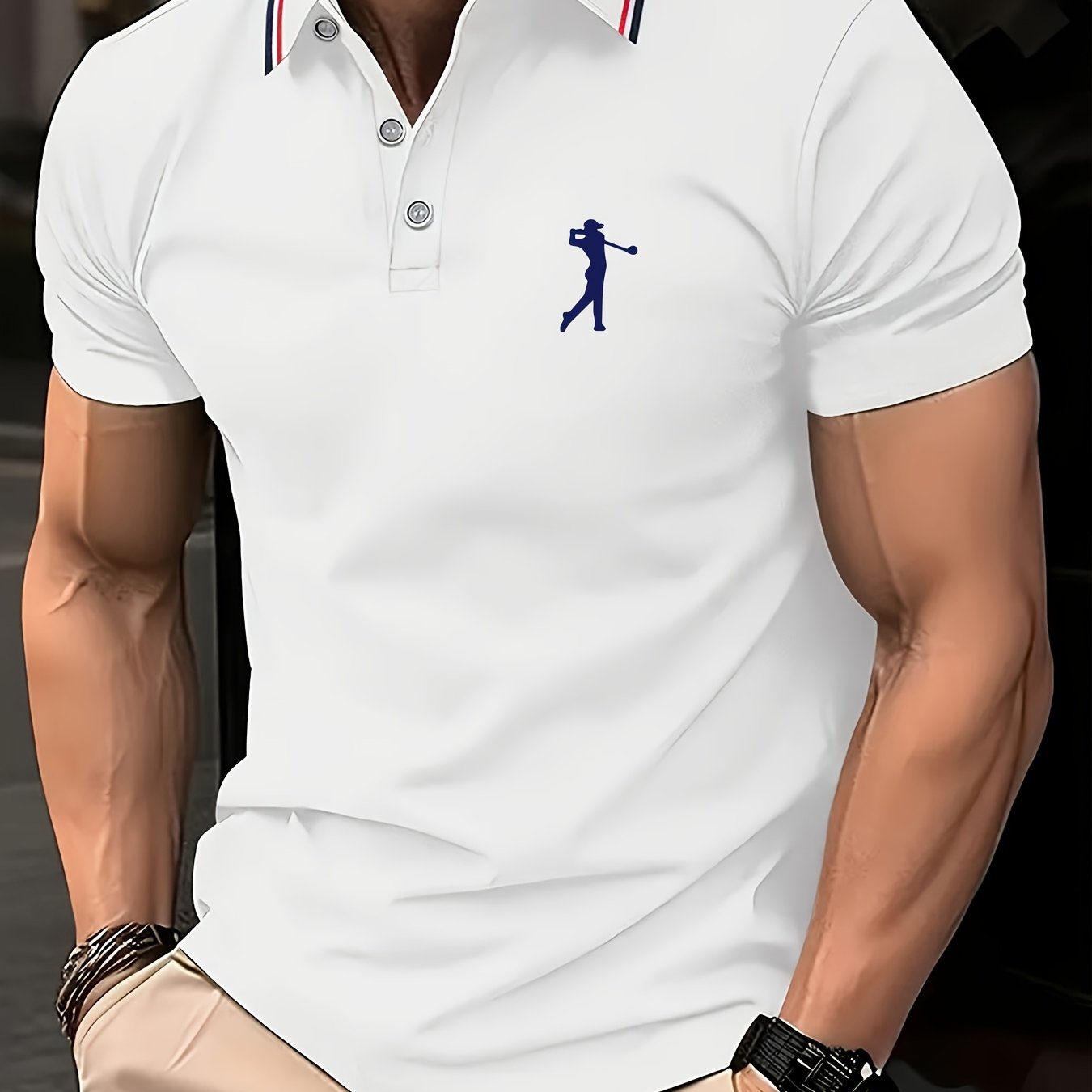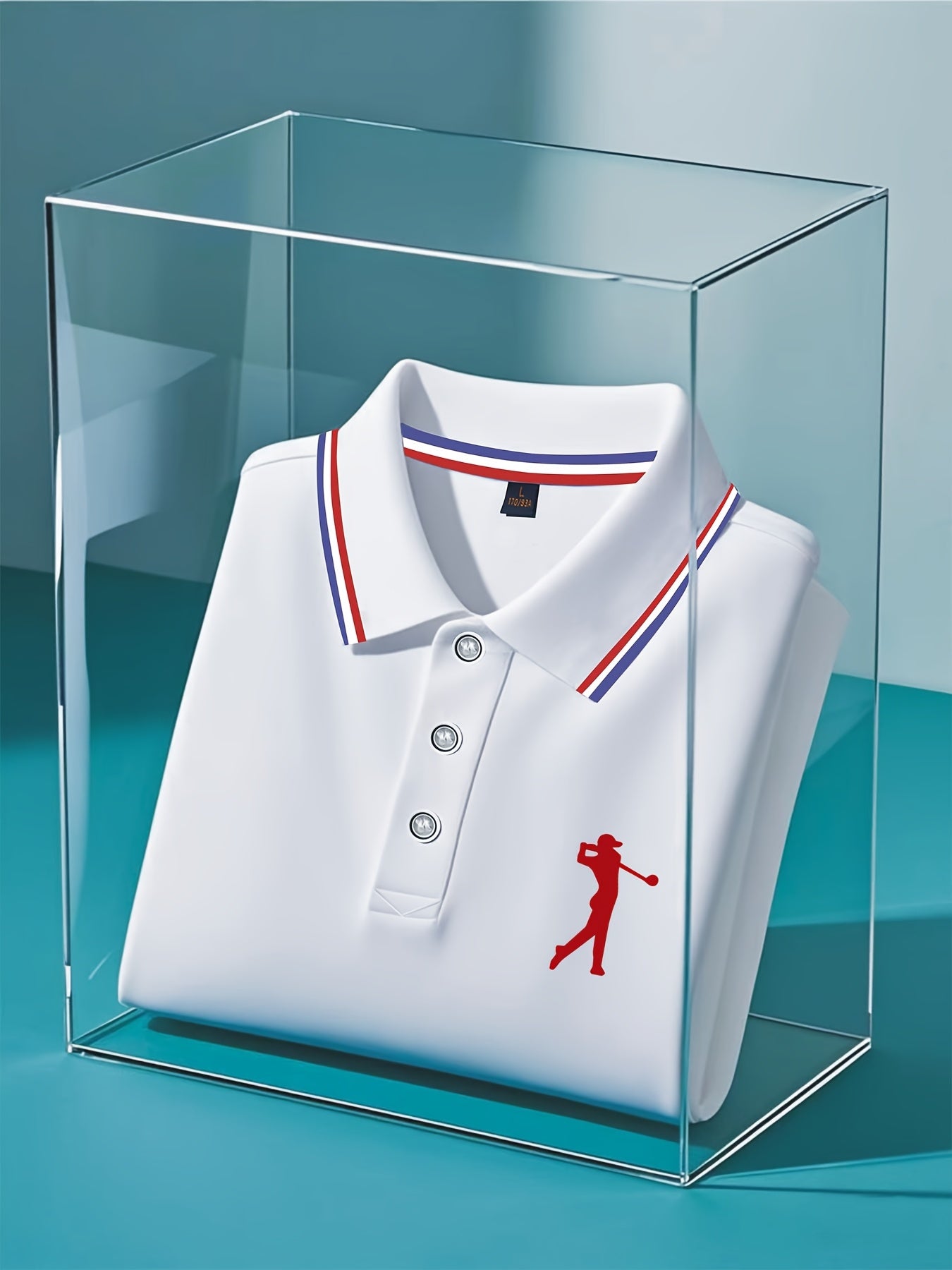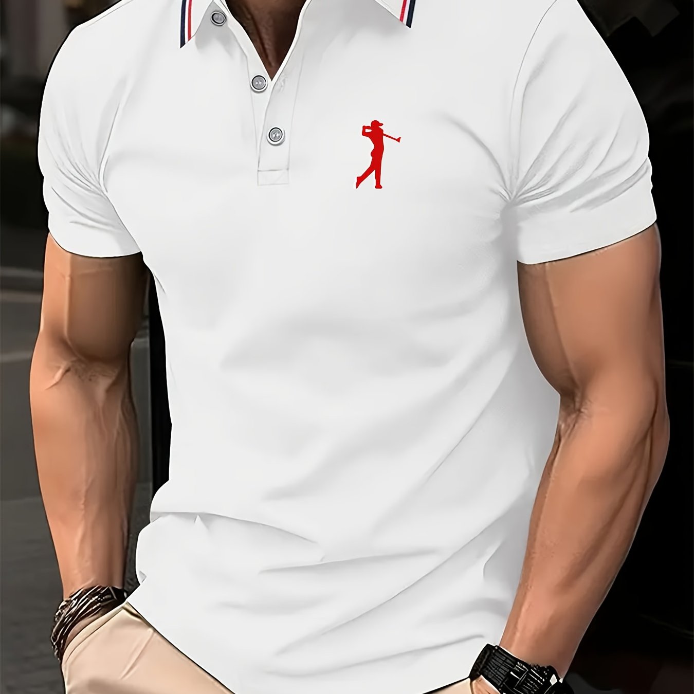 Maglietta da Uomo a Maniche Corte Bianca con Stampa Rosso per Golf, Colletto e Polsini a Righe, Tessuto Traspirante per Estate e Abbigliamento Casual, Lavabile in Lavatrice, Vestibilità Regolare