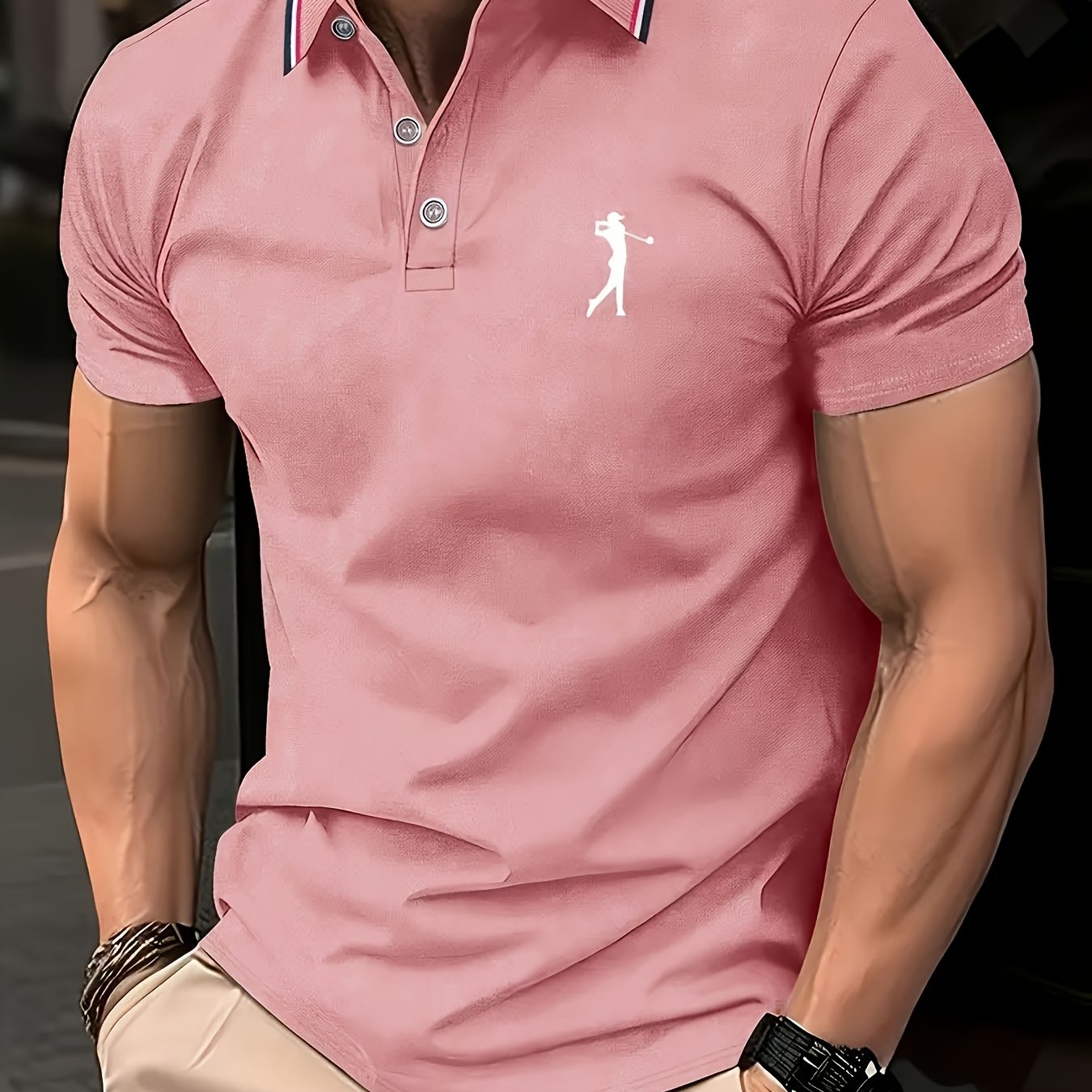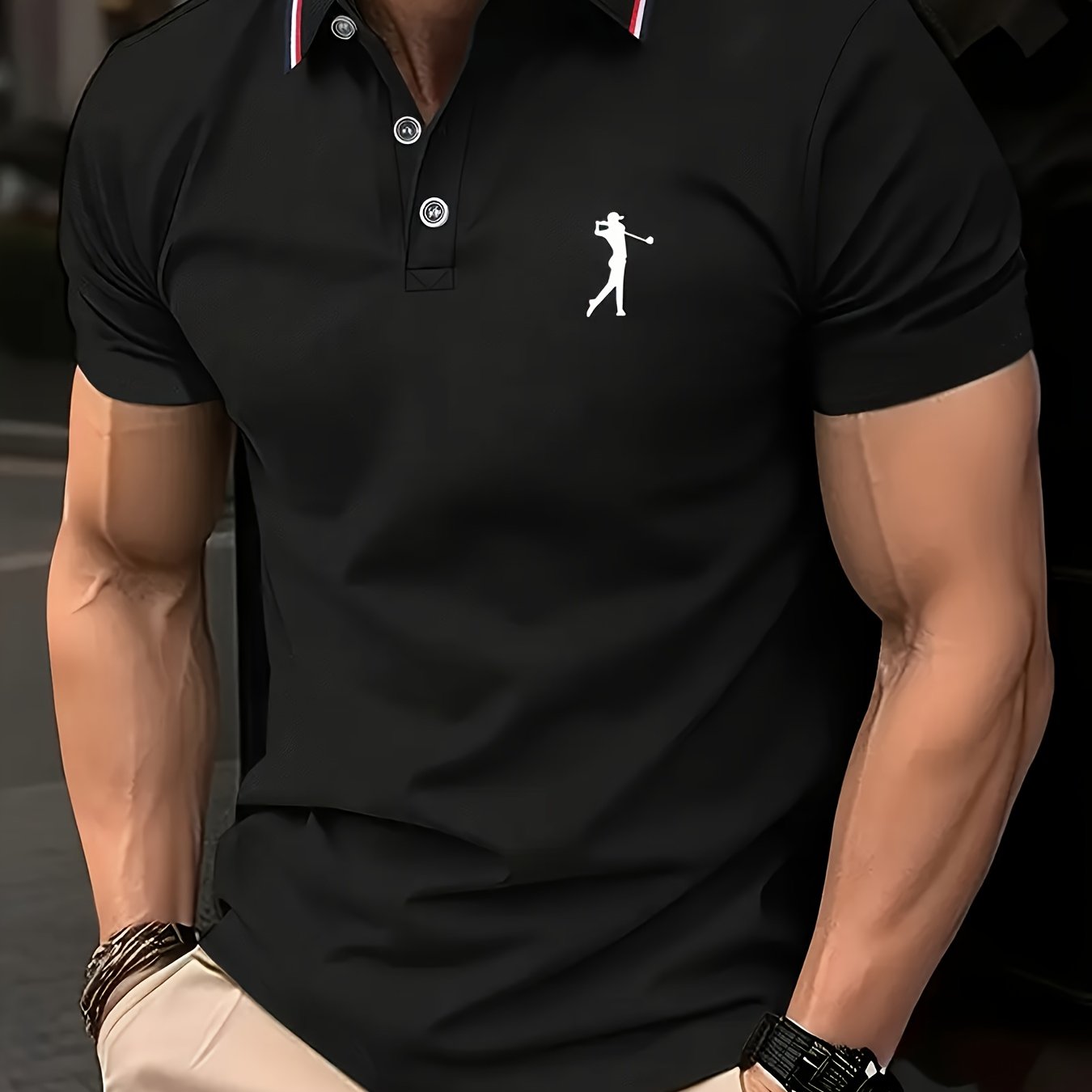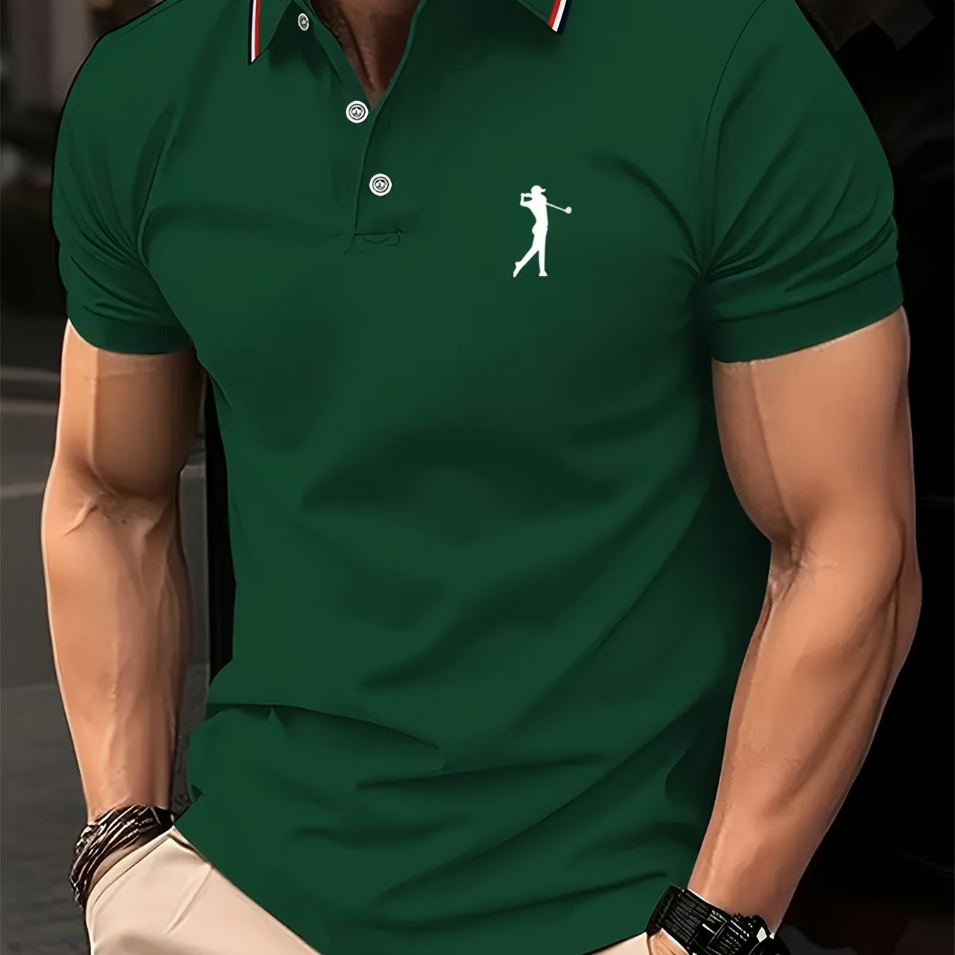 Maglietta da Uomo a Maniche Corte Bianca con Stampa Rosso per Golf, Colletto e Polsini a Righe, Tessuto Traspirante per Estate e Abbigliamento Casual, Lavabile in Lavatrice, Vestibilità Regolare