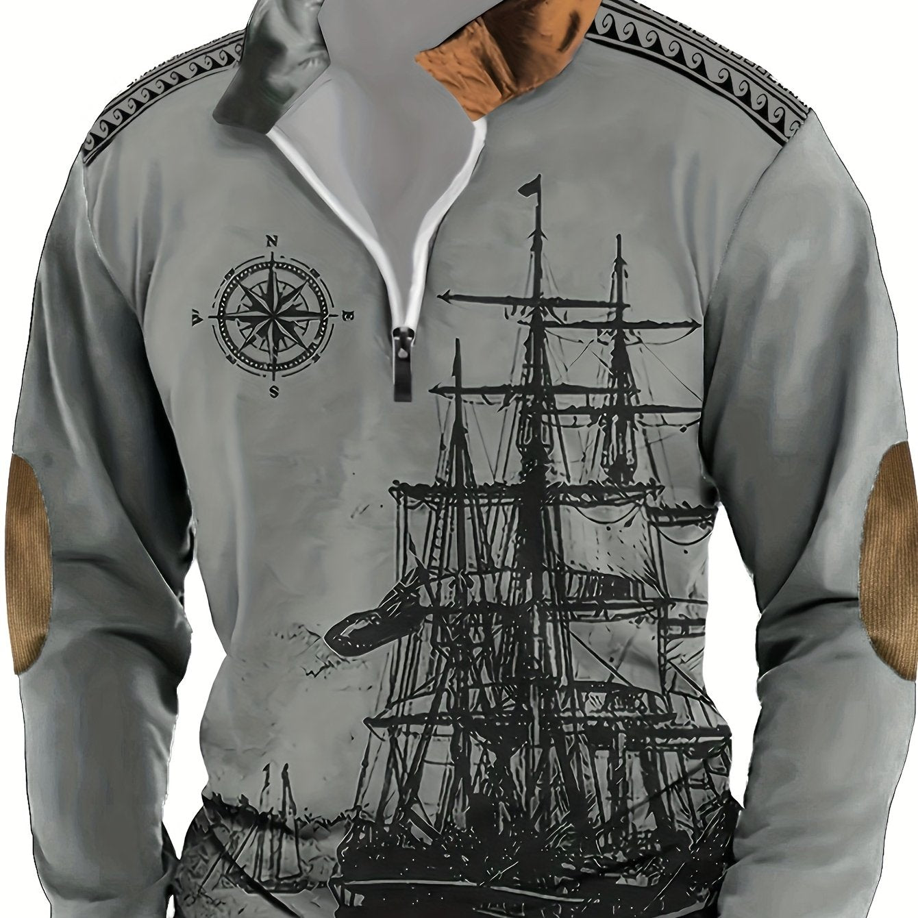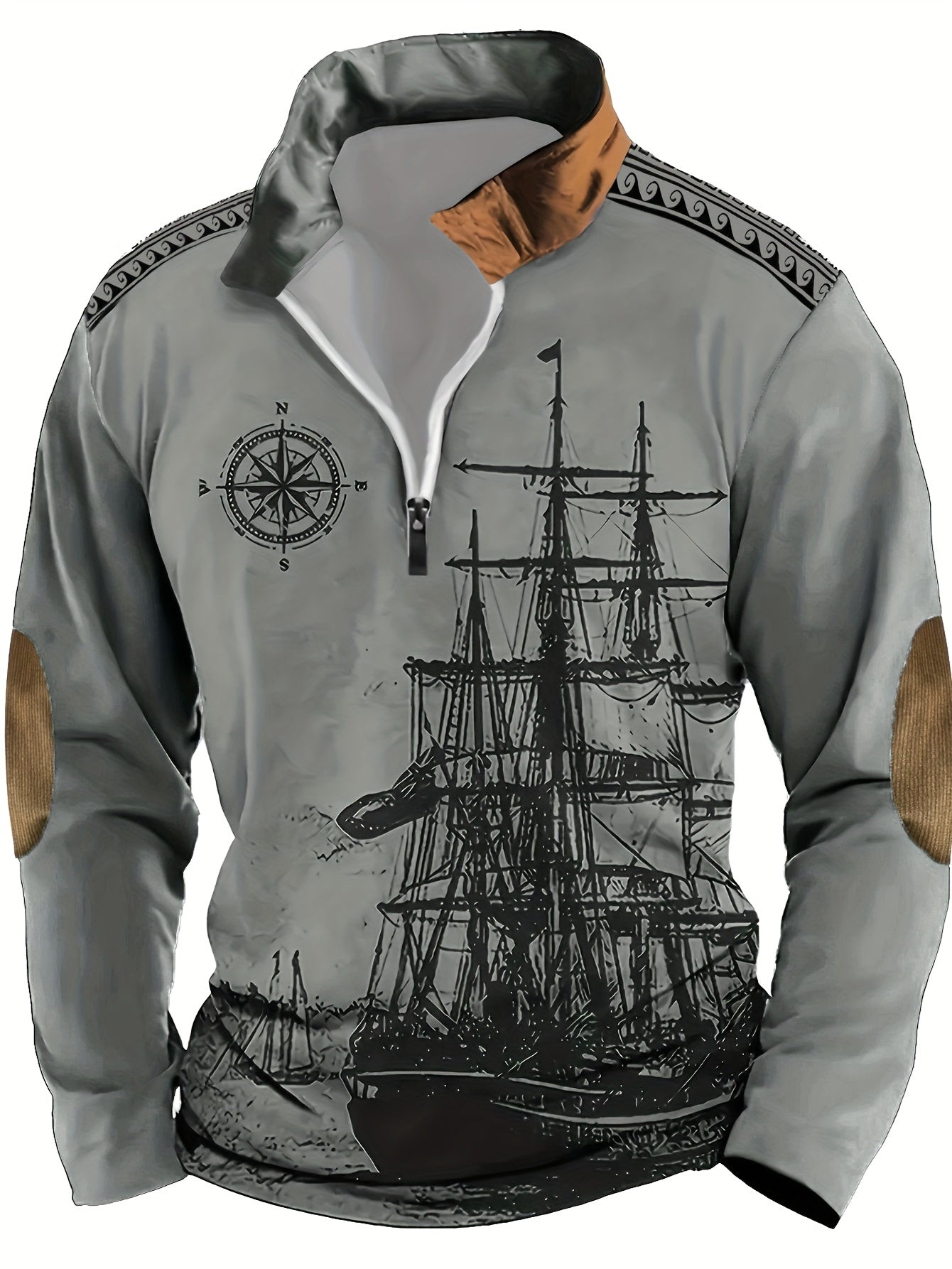 Maglietta polo a maniche lunghe con stampa di vela vintage per uomo, casual in poliestere 100% con maglia, vestibilità regolare con colletto a revers e zip, leggermente elasticizzata, 180 g/m² - Collezione autunnale