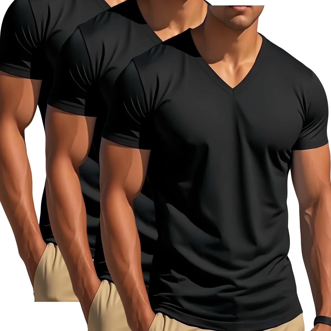 Magliette a maniche corte con scollo a V in tinta unita per uomo, 3 pezzi, essenziali estivi |, tinta unita, poliestere ad asciugatura rapida, perfette per corsa all'aperto e allenamenti, lavabili in lavatrice