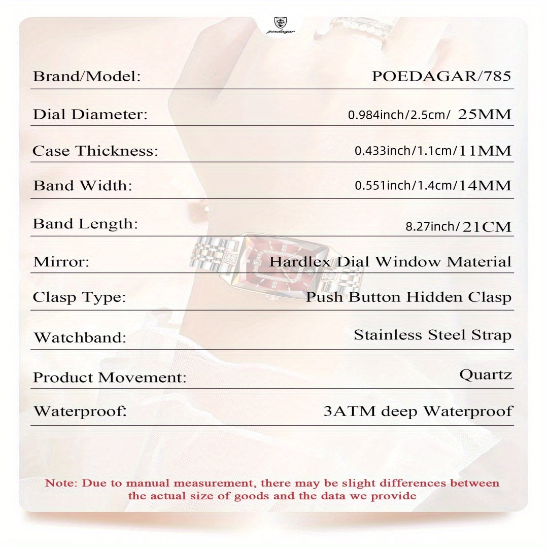 Orologio di lusso per donne POEDAGAR - Elegante calendario impermeabile con visualizzazione della data, orologio quadrato in acciaio inossidabile, cassetta in lega di zinco, cinturino in acciaio inossidabile, stile casual, accessorio elegante | Design ele