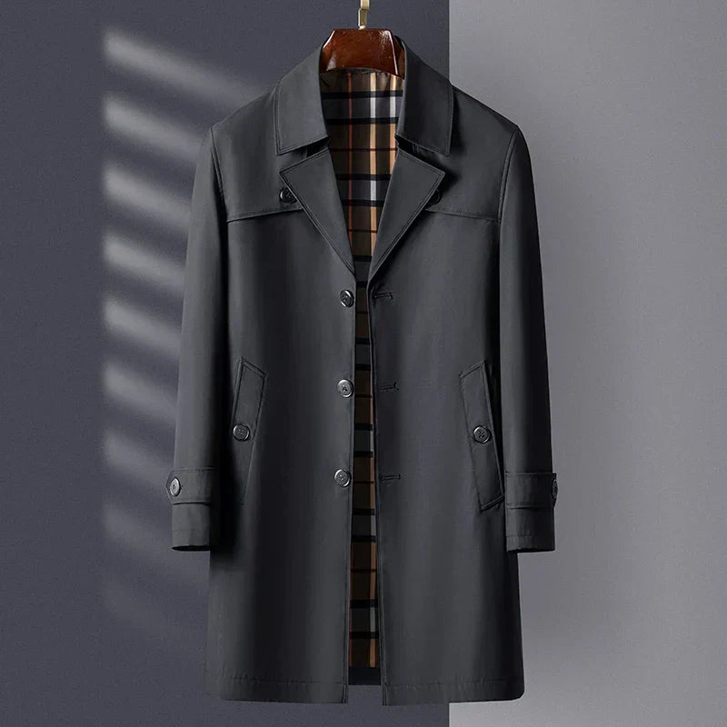 Structured shoulders, and a classic notched lapel collar exude a refined and polished look with this full length trench coat. The full-length coverage ensures protection from the elements while maintaining a sleek and versatile silhouette, perfect for both formal and casual occasions. Structured shoulders add a tailored fit, offering a confident and elevated appearance. Made with windproof and water-resistant material, this coat keeps you comfortable and prepared for unpredictable weather.