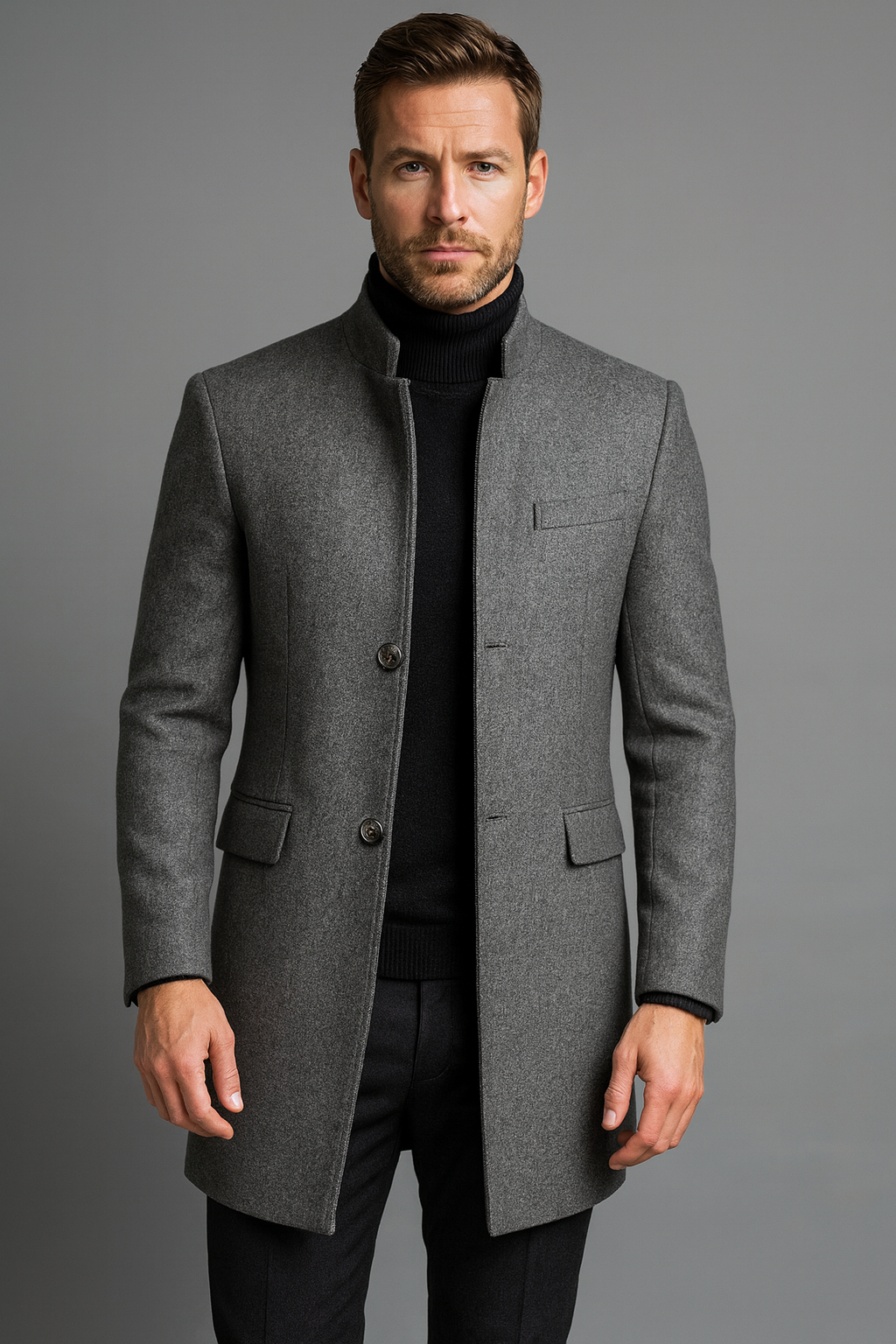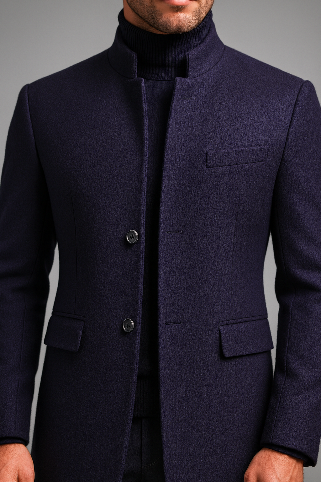 Mandarin collar and slim-fit cut that enhance confidence and masculine elegance.